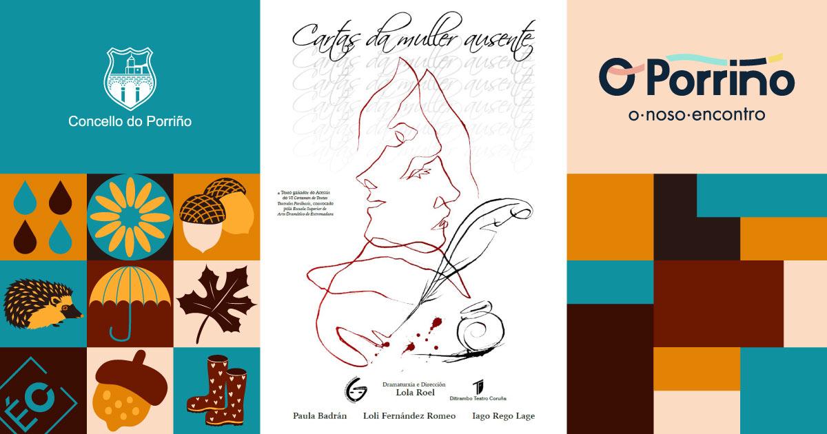 A primeira representación terá lugar este domingo, 6 de outubro, ás 18:00 horas no Centro Cultural de Porriño. A entrada é libre e gratuíta ata completar aforo. Nesta ocasión, presentarase a obra “Cartas da muller ausente”, a cargo da compañía Ditirambo Teatro. Este texto, gañador do Accésit do VI Certame de Textos Teatrais Parábasis, convocado pola Escola Superior de Arte Dramática de Estremadura, é dirixido por Lola Roel.