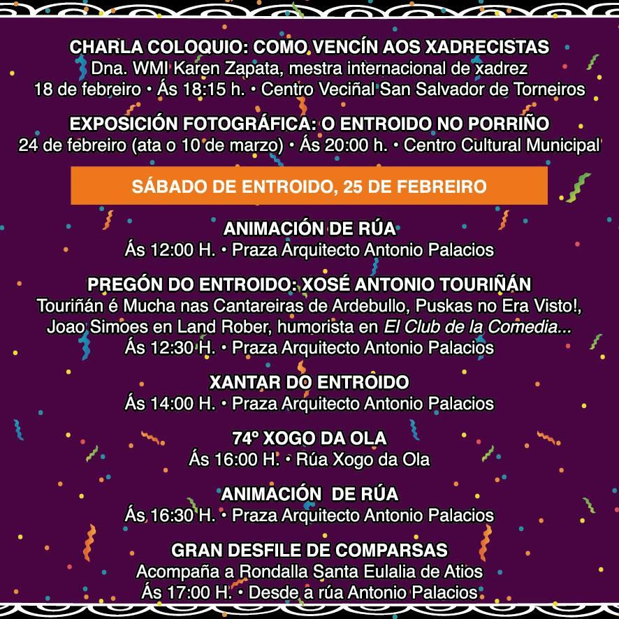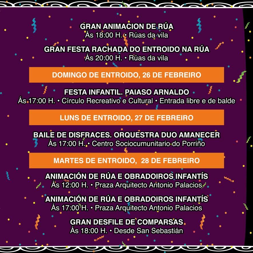 O Domingo de Entroido, día 26, Festa Infantil, ás 5 da tarde, no Centro Recreativo e Cultural; o luns, día 27, será o Baile de Disfraces, coa Orquestra Dúo Amanecer, ás 5 da tarde no Centro Socio-comunitario do Porriño. O martes, día 28, ás 12 e ás 5 da tarde, na Praza de Antonio Palacios, Animación de Rúa e ás 6 o Grande Desfile de Comparsas, dende San Sebastián.