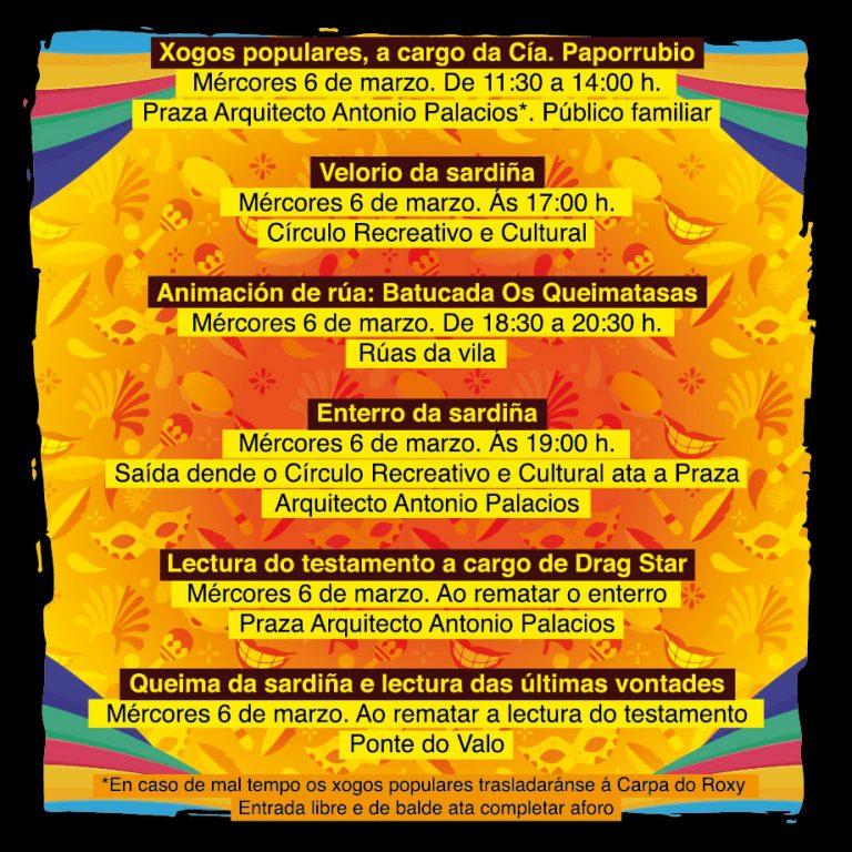 Outro dos días centrais será o mércores, 6. Esa xornada será a de despedida do Entroido e abranguerá o ‘Velorio da Sardiña’, no Centro Recreativo e Cultural, ás 17:00h. De seguido o ‘Enterro’, ás 19:00h. con saída do Centro Recreativo cara a Praza de Antonio Palacios. Seguirá a ‘LectUra do Testamento’, a cargo de Drag Star e, finalmente, na Ponte do Valo, a ‘Queimada e últimas vontades’.