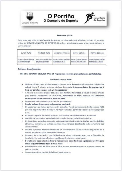 Limítase a 1 hora como máximo a reserva de cada pista . Para evitar aglomeracións o deportista deberá chegar 5 minutos antes da súa hora de entrada. O tempo máximo de reserva é de 1 hora por parellas, non por cada un dos xogadores. A reserva e abono do aluguer das pistas será fórmame telemática, a través de enlace creado polo SERVIZO MUNICIPAL DE DEPORTES, aplicándose as taxas expostas na Ordenanza Municipal de Prezos no caso das pistas de padel. Respecta en todo momento os horarios e pista asignada. Recolle a chave de acceso no polideportivo municipal. Os vestiarios e as duchas permanecerán pechadas. Tan só permanecerá aberto un aseo (WC) por sexo no polideportivo municipal, no mesmo só estará permitido o acceso a unha soa persoa á vez. As palas e raquetas son de uso privativo, non estando permitido compartir as mesmas. Considérase necesario o uso individual de botellas de auga ou bebidas isotónicas. Os deportistas non deben compartir ou intercambiar ningún material, toallas, botellas, bebidas, alimentos, linimentos ou outros produtos. Recoméndase desinfectalo todo ao termino dos adestramentos. Durante a práctica deportiva manterase en todo momento as distancias de seguridade de 2 metros, establecida polas autoridades sanitarias. O acceso ás pistas será o que habitualmente vénse realizando, salvo que a Dirección da instalación fixe outro atendendo ás medidas de circulacións e seguridade. É totalmente necesario abandonar a instalación en canto finalícese a práctica deportiva para evitar calquera contacto físico e evitar riscos. Recoméndase o uso de bólas novas e palas propias. Aconséllase utilizar o menor número de pelotas posibles. Non está permitido cambiar de lado nos xogos impares. Evitarase tocar vallas e portas de acceso ás pistas, así como postes e rede. Deixar as portas abertas. Usar a raqueta/pala e o pé para recoller a pelota e enviarlla ao adversario. Recoméndase utilizar tubos recolle pelotas ou similar.Recorda:Cumprir e respectar todas as normas e protocolos de seguridade e hixiene que se establezan que protexen a túa saúde e a dos demais. Rógase a máxima responsabilidade e prudencia, priorizando sempre minimizar o risco dun posible contaxio.Toda persoa que acceda a unha instalación deberá cumprir cos protocolos publicados no BOE, resolucións da Presidencia, do Consello Superior de Deportes, polos que se aproban, publican e actualizan os protocolos básicos de actuación para a volta aos adestramentos, práctica deportiva e o reinicio das competicións.Estas recomendacións en todo momento estarán suxeitas ás indicacións das autoridades sanitarias.
