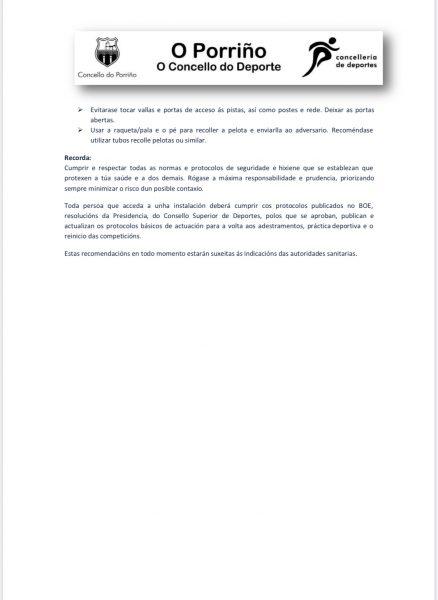 NORMAS XERAIS Os positivos por COVID 19, aínda asintomáticos, non poderán iniciar a práctica deportiva. Recoméndase que todos os usuarios, realicen unha vixilancia activa dos seus síntomas. Ante calquera síntoma ou en caso de sospeita de estar infectado, ou estar en contacto con persoas infectadas ou baixo sospeita de estalo, débese evitar calquera actividade, poñéndose en contacto de forma inmediata cos servizos sanitarios e seguir todas as súas indicacións. Recoméndase o control de temperatura previamente antes de comezar calquera actividade ou acceder á instalación deportiva. O deportista terá coidado de non tocar no posible obxectos ou equipamento de uso colectivo. Aconséllase a limpeza e desinfección da raqueta/pala antes e logo do seu uso. Os deportistas han de manter as pautas estritas de aseo persoal, conduta e coidado para evitar contaxios. Lavarse as mans antes e logo de entrar ou saír das pistas. Recoméndase o uso de mascarillas, luvas, cintas ou panos para o cabelo, así como o uso de lentes, sempre que a actividade deportiva así o permita. É obrigatorio o uso de mascarilla ata estar dentro do recinto de xogo. Observando especial cumprimento nas zonas de tránsito no que poida haber risco de proximidade doutros usuarios. Antes e logo da práctica deportiva é moi importante lavarse as mans con auga e xabón ou solucións de gel hidroalcohólico, sendo necesario que se leve polo deportista botes de gel de uso individual.