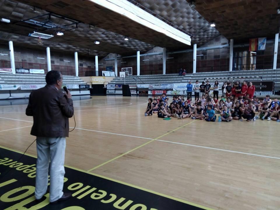 O concelleiro Marcelino Coto asiste ao peche das Escolas de Baloncesto Base do Porriño, este venres no Pavillón Municipal