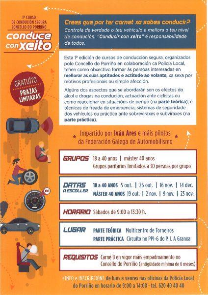 Ó longo dos meses de outubro, novembro e decembro, sempre en sábados, continuará o curso “Conduce con xeito”. En cada quenda haberá 30 personas. Na prevista para o 19 de outubro, será un grupo de maiores de 40 anos, tamén paritario.