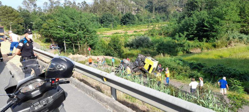 O terceiro accidente atendido polos efectivos de Protección Civil do Porriño foi o envorco dun camión na estrada de Salceda (PO-510) que transportaba un contedor con restos de madeira.