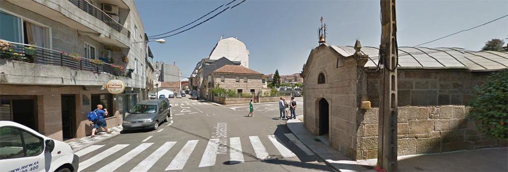 A capela foi levantada a finais do século XIX e posteriormente restaurada e ampliada a comezos do XX. É un edificio de reducidas dimensións con planta de cruz latina. Se o camiñante ten ganas dun pouco de arte urbana, sería posible desviarse á man esquerda pola rúa da Ola, onde se pode ver o gran muro da rúa Cando cheo de graffitis.