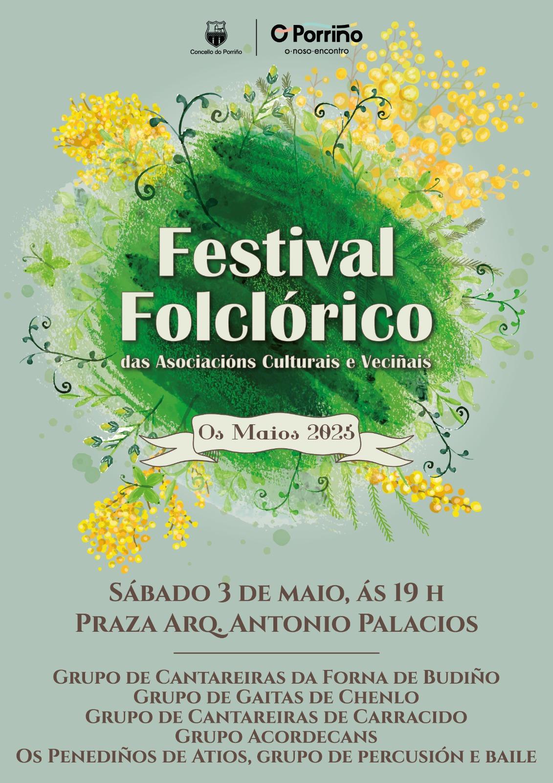O Porriño, 2 de maio de 2025.- O Porriño celebra este sábado, 3 de maio, o Festival Folclórico das Asociacións Culturais e Veciñais. A cita desenvolverase a partir das 19:00 horas na Praza Antonio Palacios e converterá este emblemático espazo nun escenario de encontro coa tradición e co folclore galego, da man de diferentes agrupacións do municipio que traballan na preservación e difusión da nosa cultura popular.
